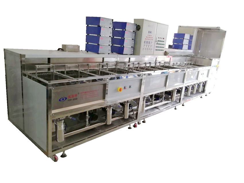 該清洗機主要由超聲波發生器、換能器、清洗槽、儲液槽、循環過濾系統、自動恒溫加熱系統、拋動系統、抽氣罩、冷水機、機架、電控柜等組成。