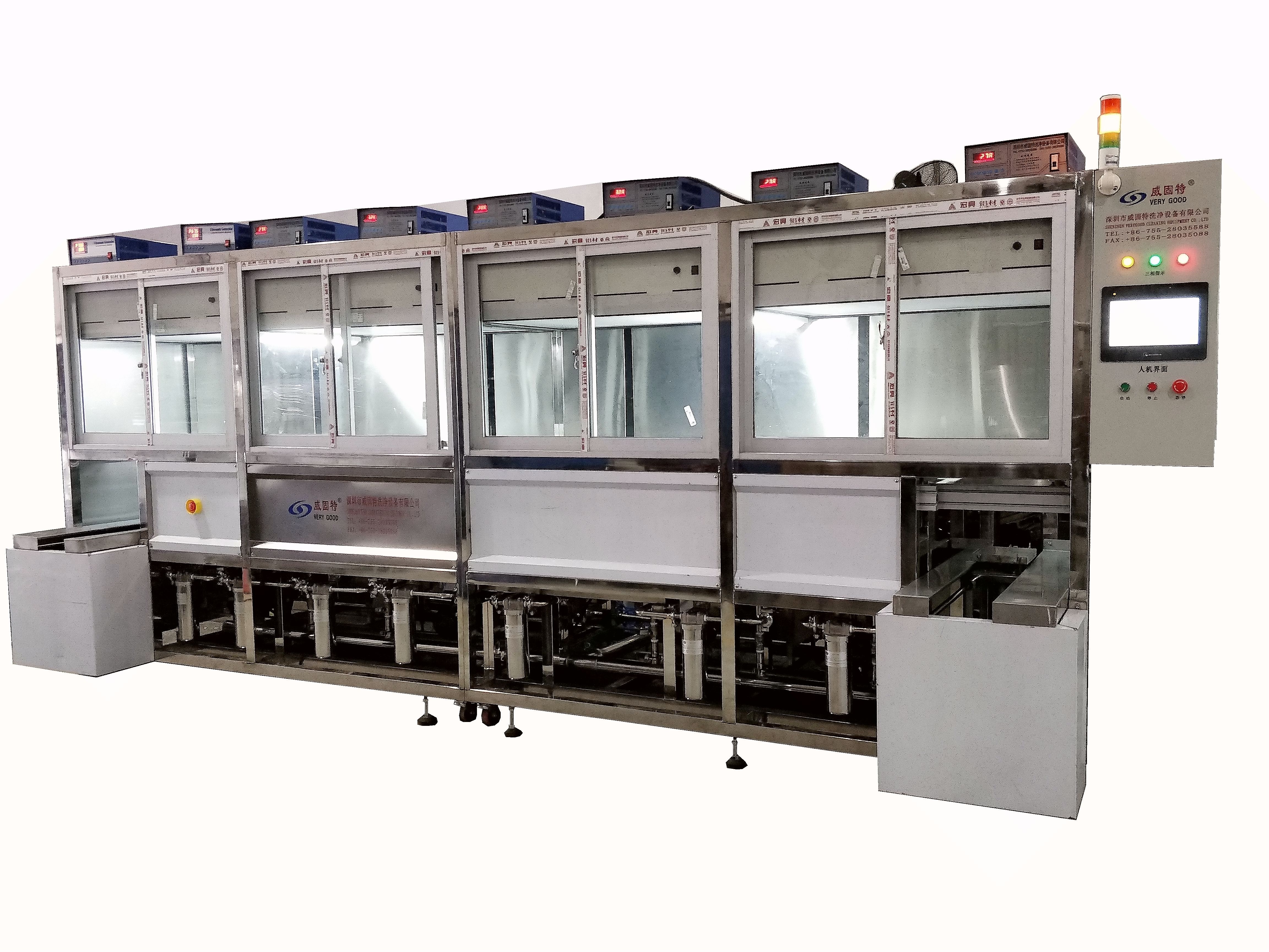 威固特全自動石英晶振監控片深圳超聲波清洗機設備共有8個功能槽,配置有循環過濾系統、自動恒溫系統、觸摸屏系統、拋動系統、超聲波清洗系統、預熱箱系統、溢流系統、噴淋系統等。